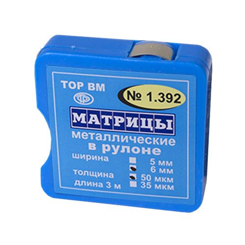 Набор матриц и приспособлений стоматологических для моделирования пломб «ТОР ВМ» - матрицы металлические № 1.392 в рулоне (квадратная упаковка) ширина 6 мм, длина 3 м. Толщина 50 мкм