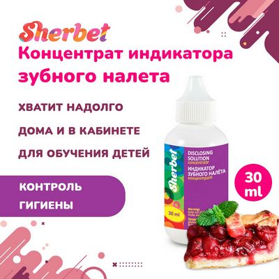 Концентрат индикатора зубного налёта Sherbet Disclosing Solution представляет собой концентрированный раствор эритрозина красного, используемый для выявления зубного налёта. Эритрозин (Erythrosin) — краситель красного цвета, содержащий в своём составе йод. Имеет приятный аромат вишнёвого пирога.